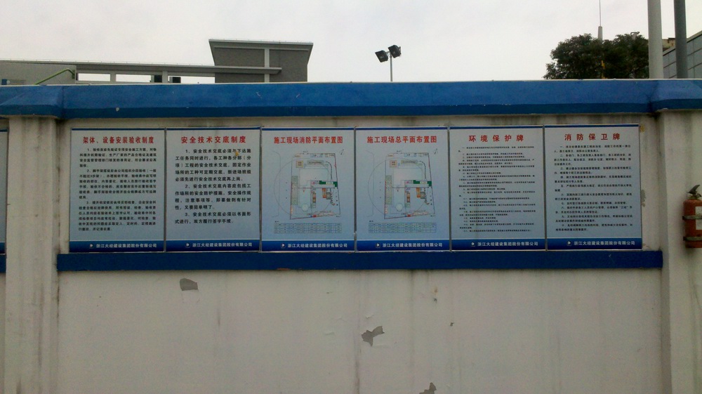 “安全文明標(biāo)準(zhǔn)化”即是通過各種方式做好安全防護(hù)、文明施工標(biāo)準(zhǔn)化管理工作,并把工作落實(shí)到現(xiàn)場每一個角落,讓每個細(xì)節(jié)都能夠體現(xiàn)出安全和文明的存在。現(xiàn)場的主要進(jìn)出口設(shè)有規(guī)格統(tǒng)一、位置合理、字跡端正、線條清晰、表示明確的“五牌一圖”及安全生產(chǎn)宣傳和警示牌。