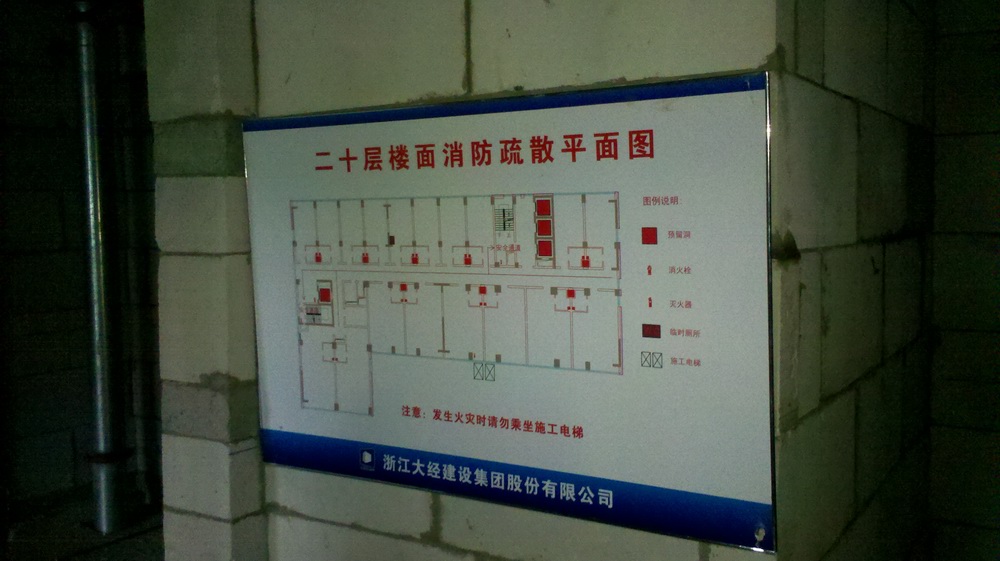 施工現(xiàn)場設(shè)有消防疏散通道,每幢樓醒目處均設(shè)置消防豎管,同時按規(guī)范配置滅火器,大大消除了火災(zāi)發(fā)生的隱患;在各結(jié)構(gòu)層便于操作處均設(shè)有消防軟管接口,醒目處懸掛樓層消防疏散平面圖,以方便發(fā)生火災(zāi)時自救和現(xiàn)場施工人員安全撤離。