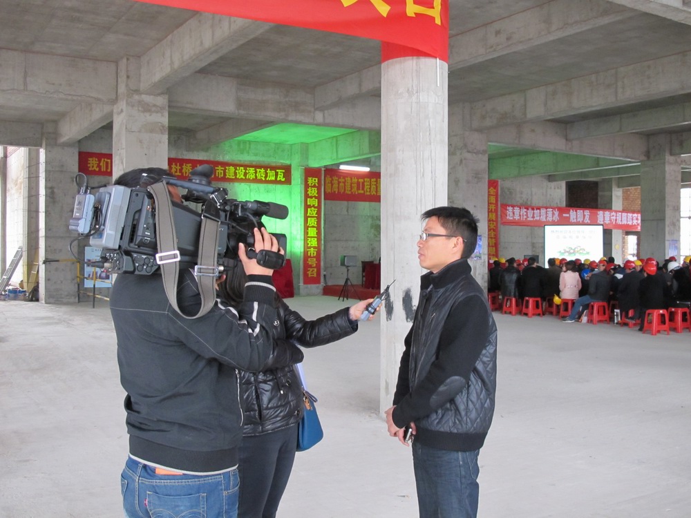 現(xiàn)場(chǎng)會(huì)時(shí),臨海電視臺(tái)的記者采訪(fǎng)了市建筑工程質(zhì)量監(jiān)督站站長(zhǎng)葉青同志和我公司副總經(jīng)理王國(guó)棉同志。葉青同志認(rèn)為東部很多工程項(xiàng)目都是招商引資過(guò)來(lái)的,大多是外地的建設(shè)單位和施工單位,對(duì)我們當(dāng)?shù)匕踩芾硪?guī)定不是很熟悉,以這個(gè)工地為標(biāo)桿,開(kāi)展樹(shù)標(biāo)桿學(xué)標(biāo)桿活動(dòng)旨在提高東部區(qū)塊施工現(xiàn)場(chǎng)的管理水平。王國(guó)棉同志著重介紹了該工程安全方面的一些亮點(diǎn),如臨邊防護(hù)、電梯井、洞口防護(hù)都采用定型化、工具化的產(chǎn)品。工程現(xiàn)場(chǎng)布置人性化,特別是在三樓預(yù)埋構(gòu)造柱的鋼筋周邊加了圓形保護(hù)筒,一則防止對(duì)鋼筋的破壞,二則安全防護(hù),防止人不小心踩上去。