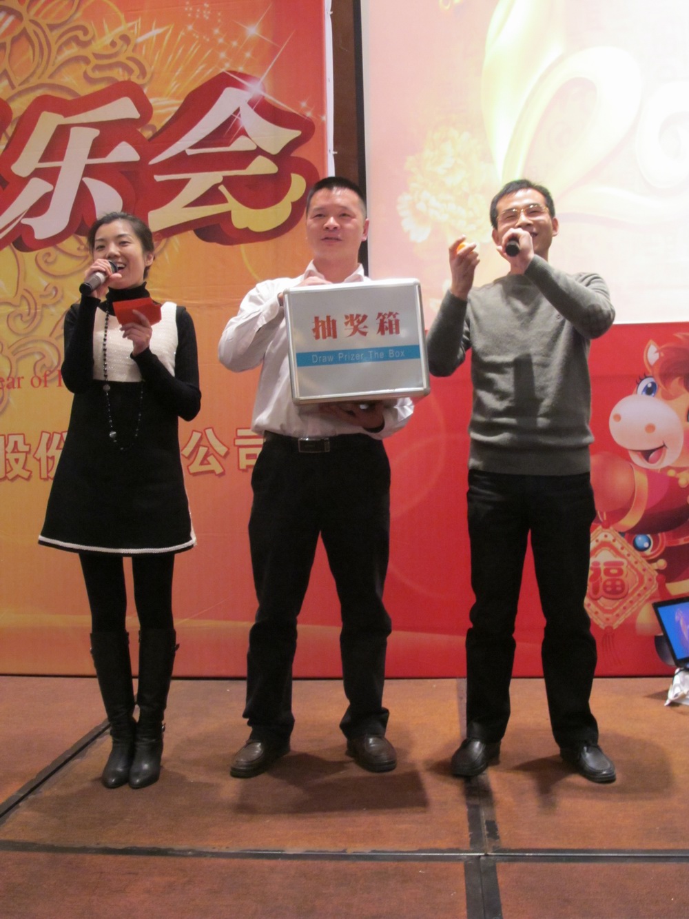 年會,最令人期待、最激動人心的時(shí)刻是抽獎環(huán)節(jié)。放眼望去,臺上擺滿了獎品,一等獎為mini ipad,二、三等獎均為價(jià)值不菲的名牌家紡。每個人都做好了心理準(zhǔn)備,默祈大彩頭降臨自己。此外,為了增加抽獎的喜慶氣氛,今年的晚宴還別出心裁,規(guī)定中獎?wù)唔毣卮鸪鲋鞒秩颂岢龅膯栴}或者即興表演一個節(jié)目后才能領(lǐng)取獎品。但這并沒有難倒我們的獲獎?wù)?,他?/span>或詩歌朗誦,或民族舞表演,或引吭高歌,絲毫不怯場,熱情參與的氛圍讓晚宴的氣氛達(dá)到了高潮。