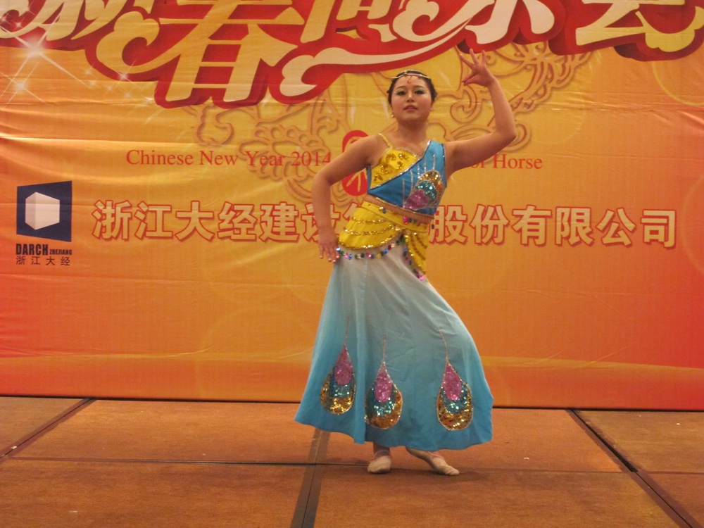 財(cái)務(wù)部實(shí)習(xí)生韓佳迎表演傣族舞。 金望杰高舉橫幅,祝大家馬到成功。